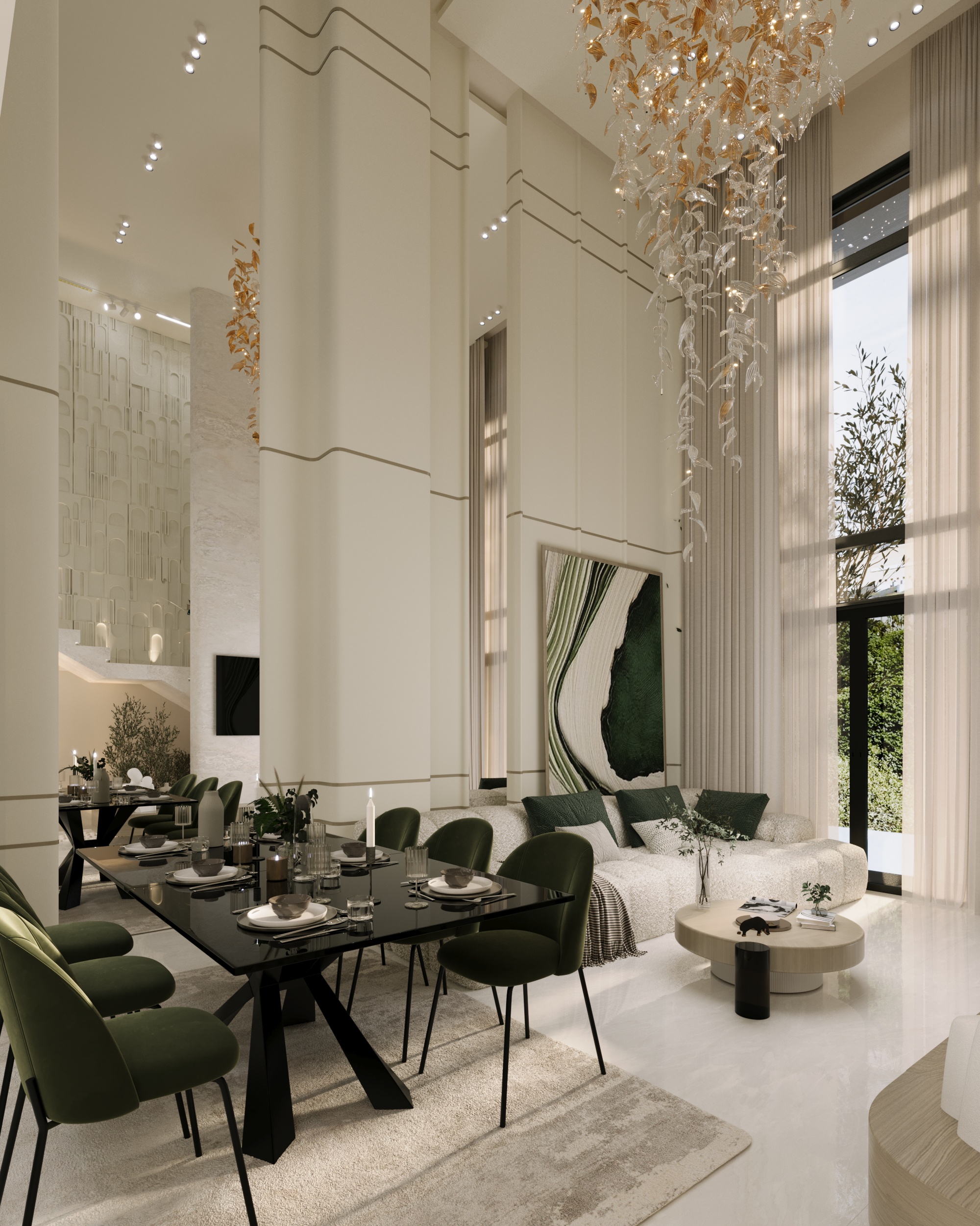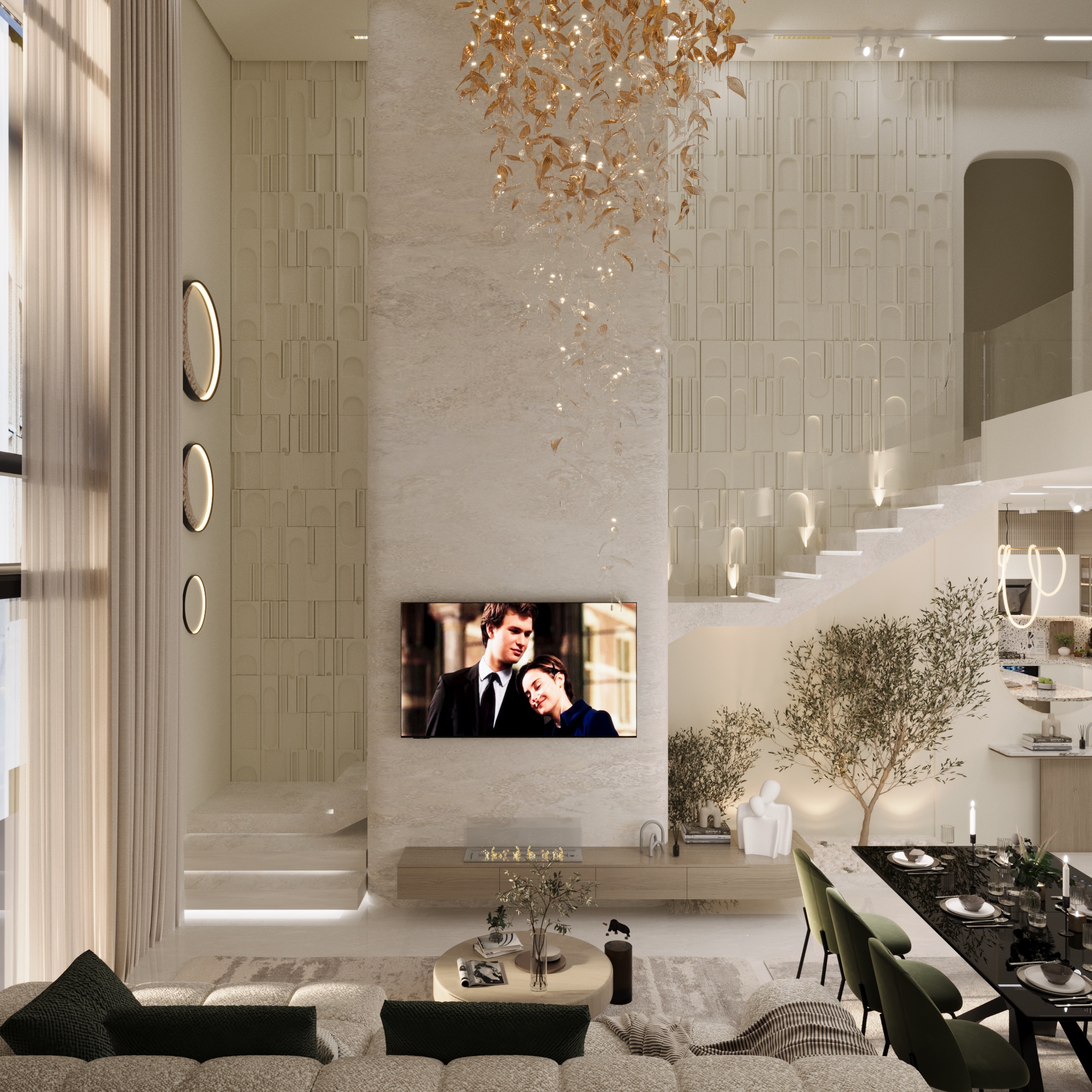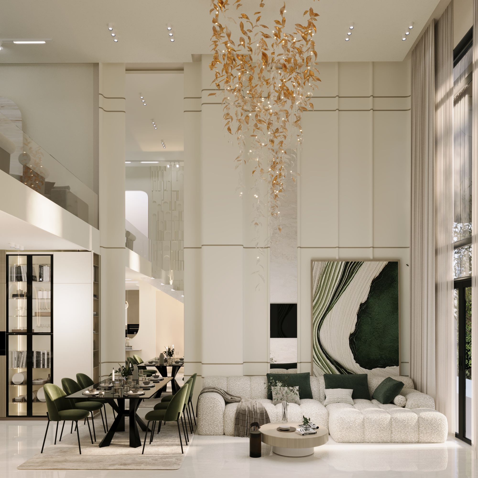 The design embodies a refined blend of contemporary elegance and modern luxury, where neutral tones such as beige, white, and soft gray dominate, reflecting a sense of tranquility and spaciousness. The double-height ceiling enhances the grandeur of the space, while the hanging golden chandelier adds a striking visual touch as a central feature. Subtle architectural details are highlighted on the walls, complemented by large windows that allow natural light to flood the room. Green accents and plants introduce a harmonious touch of nature. The modern furniture with curved lines, along with carefully selected décor, strikes a balance between opulence and comfort, creating a design that captures the splendor of contemporary beauty in every detail.