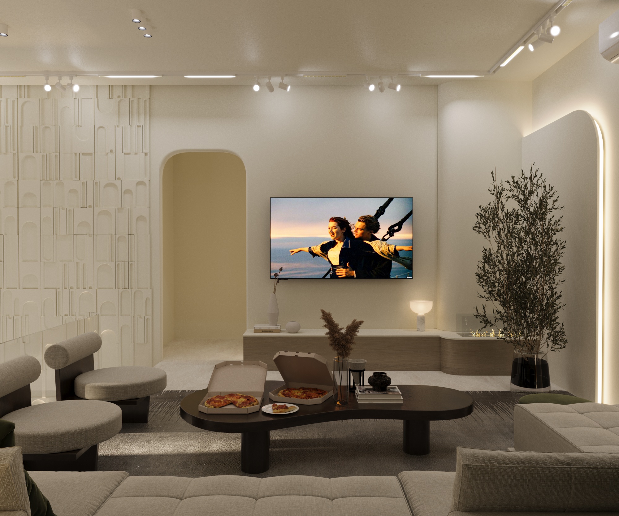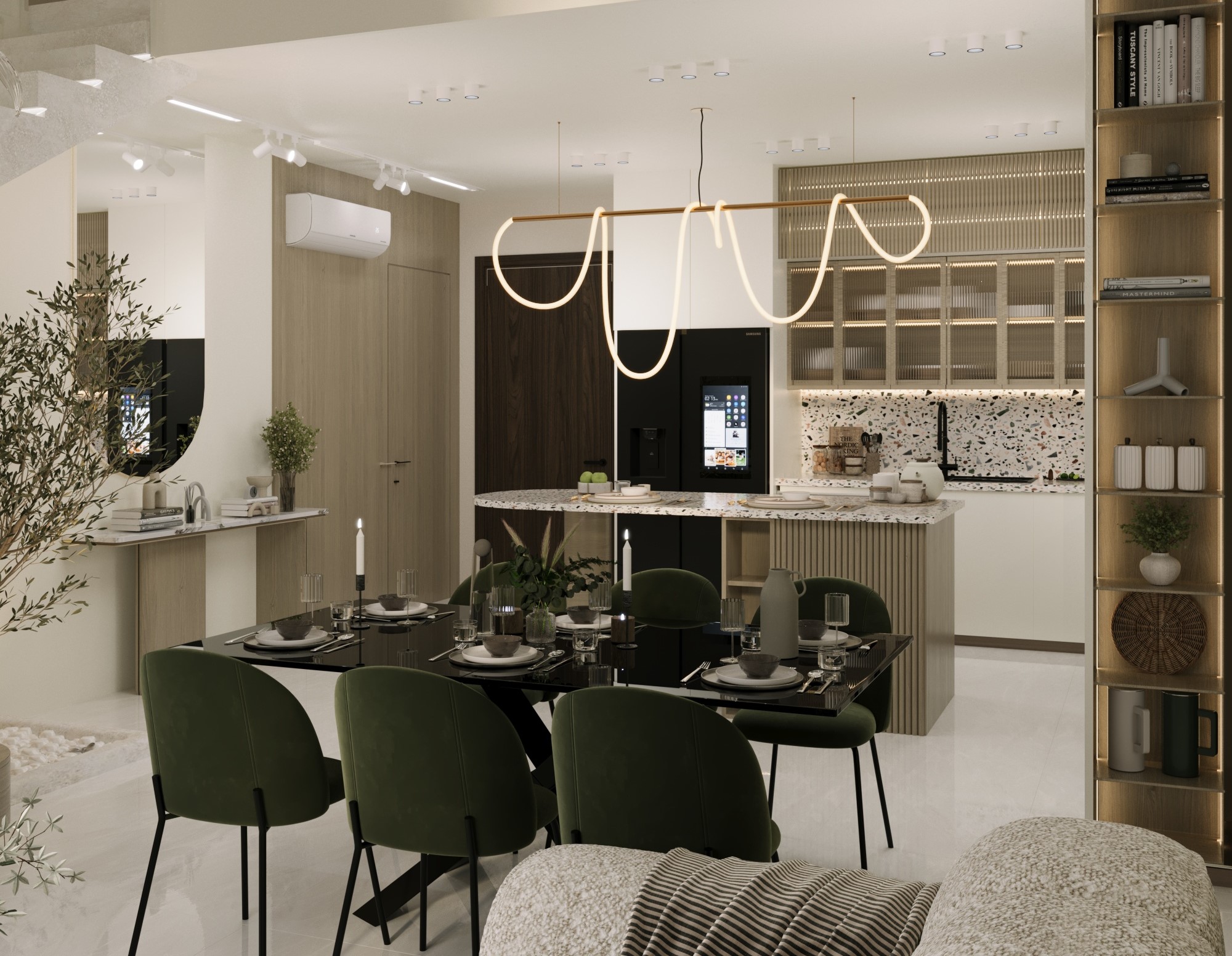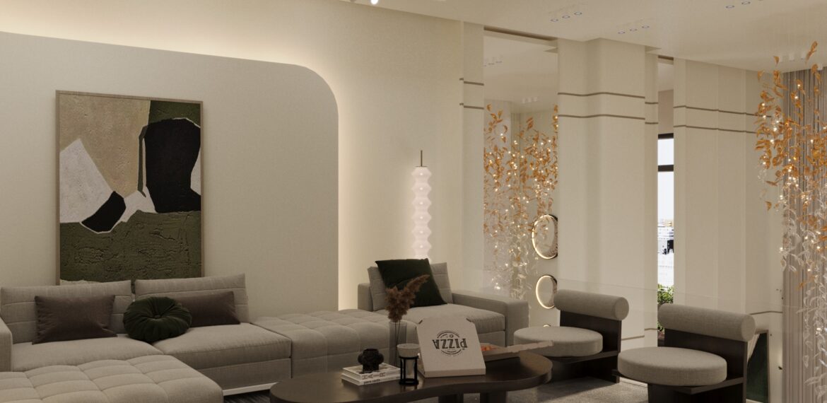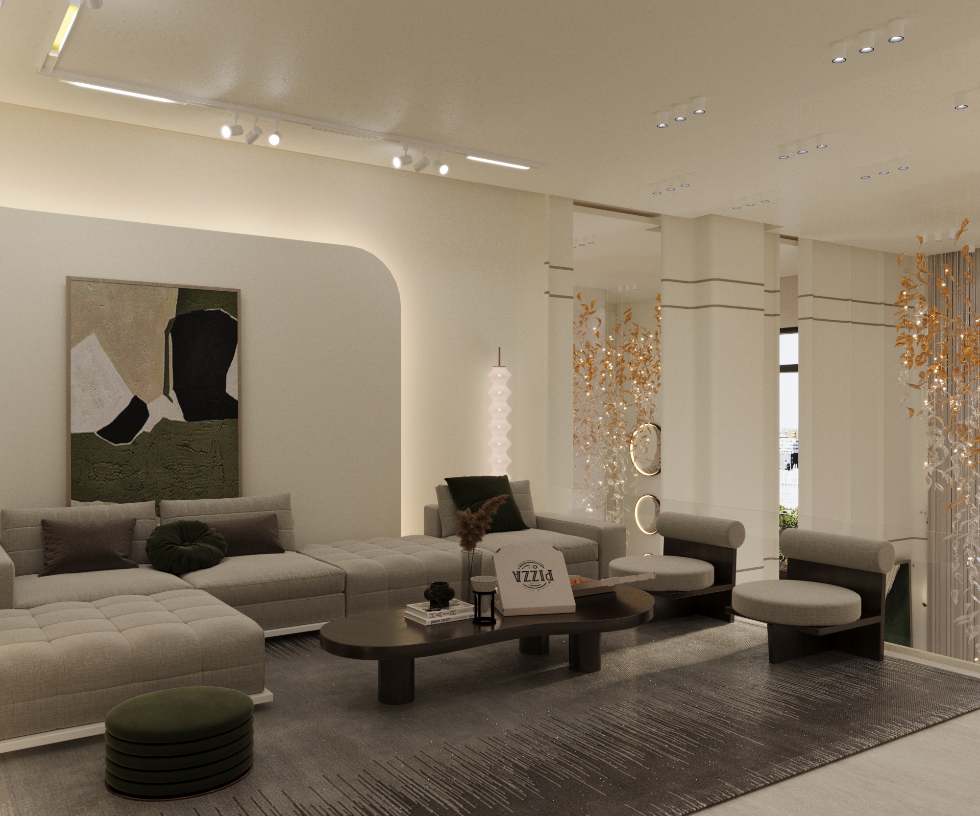 The design embodies a refined blend of contemporary elegance and modern luxury, where neutral tones such as beige, white, and soft gray dominate, reflecting a sense of tranquility and spaciousness. The double-height ceiling enhances the grandeur of the space, while the hanging golden chandelier adds a striking visual touch as a central feature. Subtle architectural details are highlighted on the walls, complemented by large windows that allow natural light to flood the room. Green accents and plants introduce a harmonious touch of nature. The modern furniture with curved lines, along with carefully selected décor, strikes a balance between opulence and comfort, creating a design that captures the splendor of contemporary beauty in every detail.