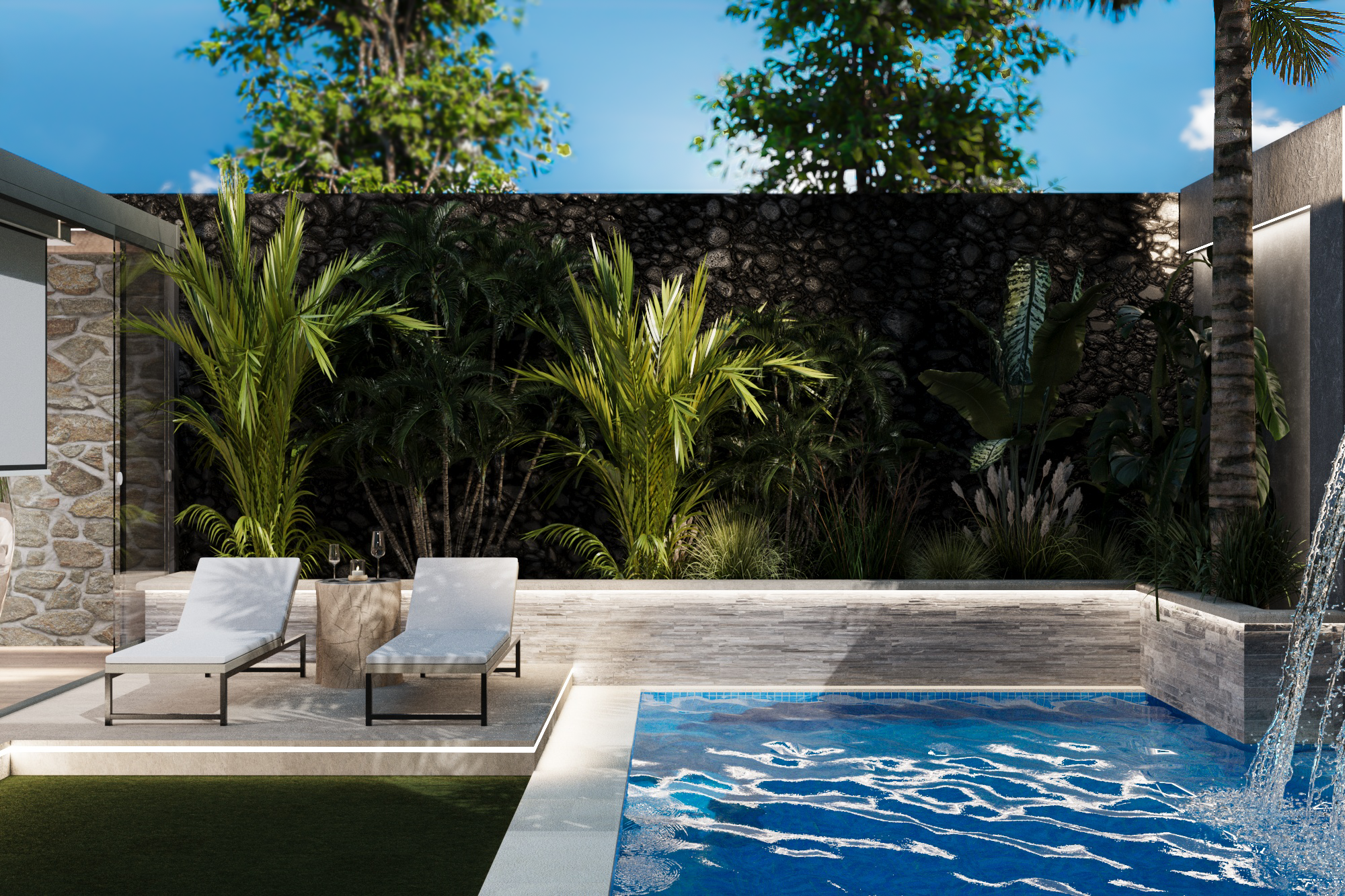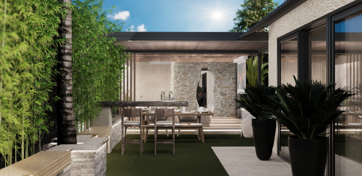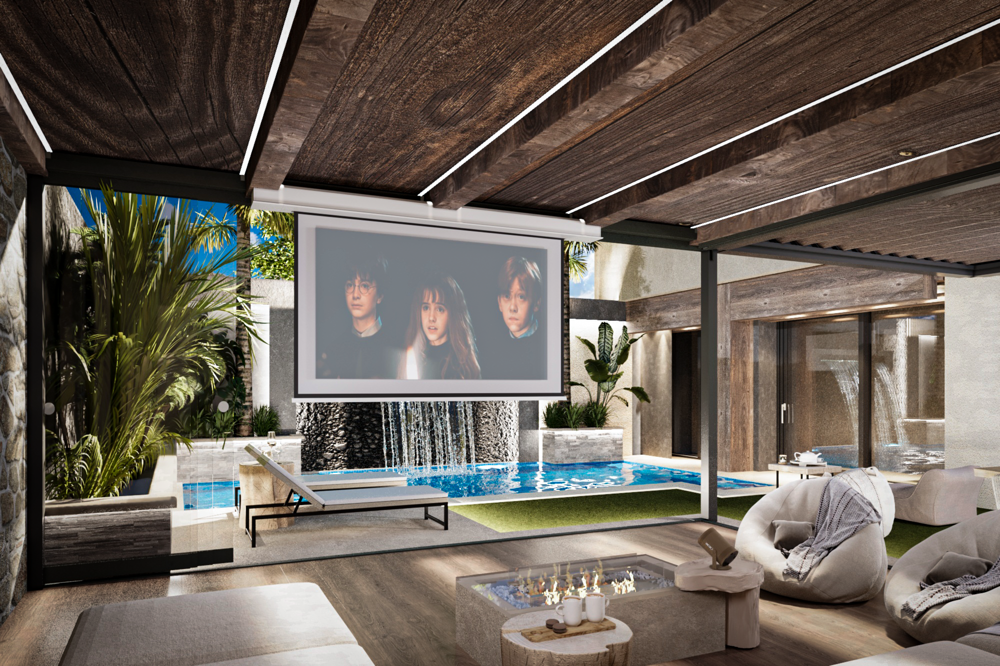 The exterior design of the modern rustic style embodies a harmonious blend of nature and comfort, with natural materials such as wood and stone dominating the architectural details. The serene pool, complemented by a flowing waterfall, adds a sense of tranquility, while being surrounded by an abundance of plants, transforming the space into a vibrant green oasis. Beauty and warmth come together in the enclosed seating area made of natural wood, where comfort seamlessly blends with the charming rural ambiance. Scattered trees and plant-filled pathways complete the overall scene, reflecting a design that unites humanity with nature in a serene and inspiring setting.