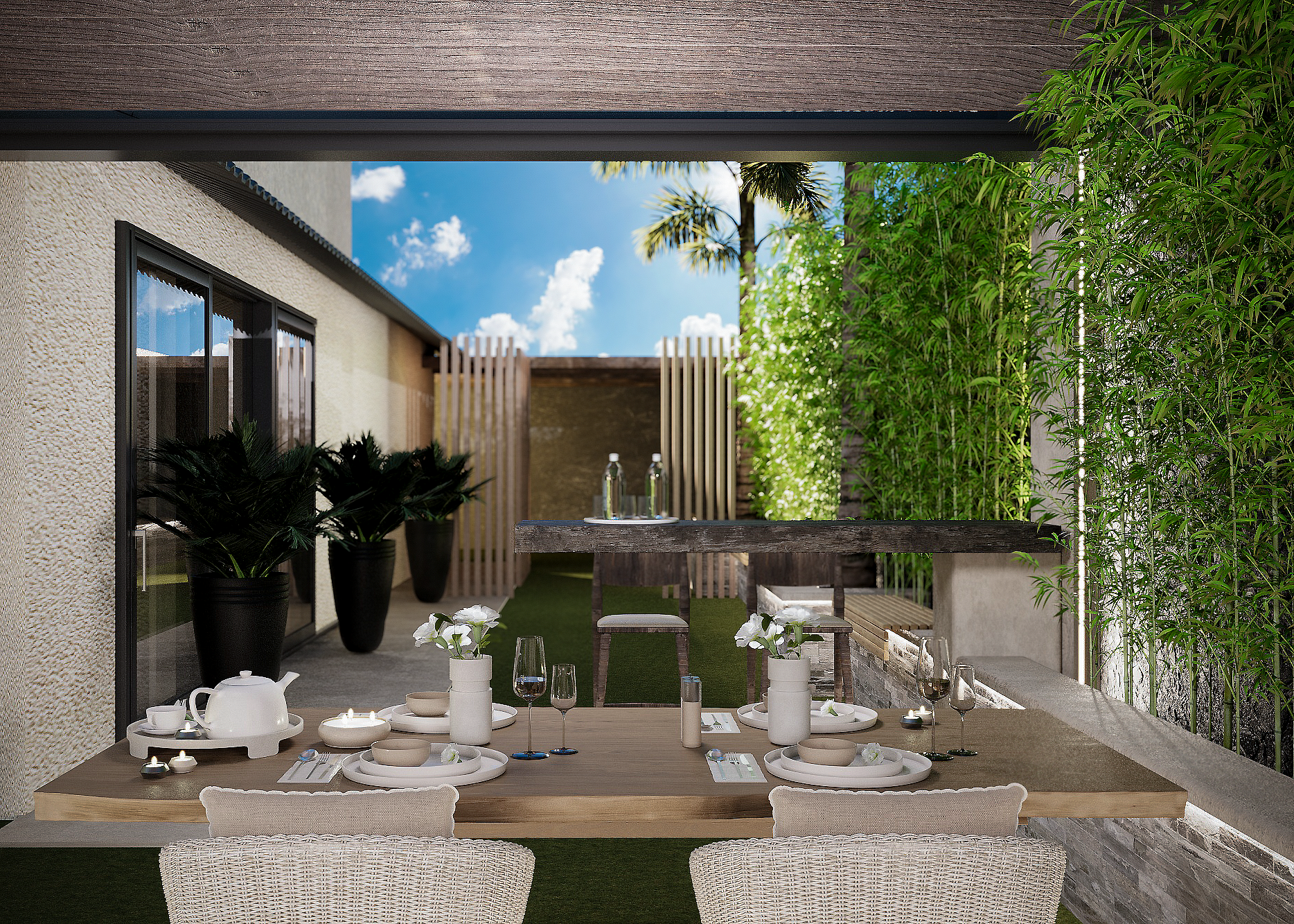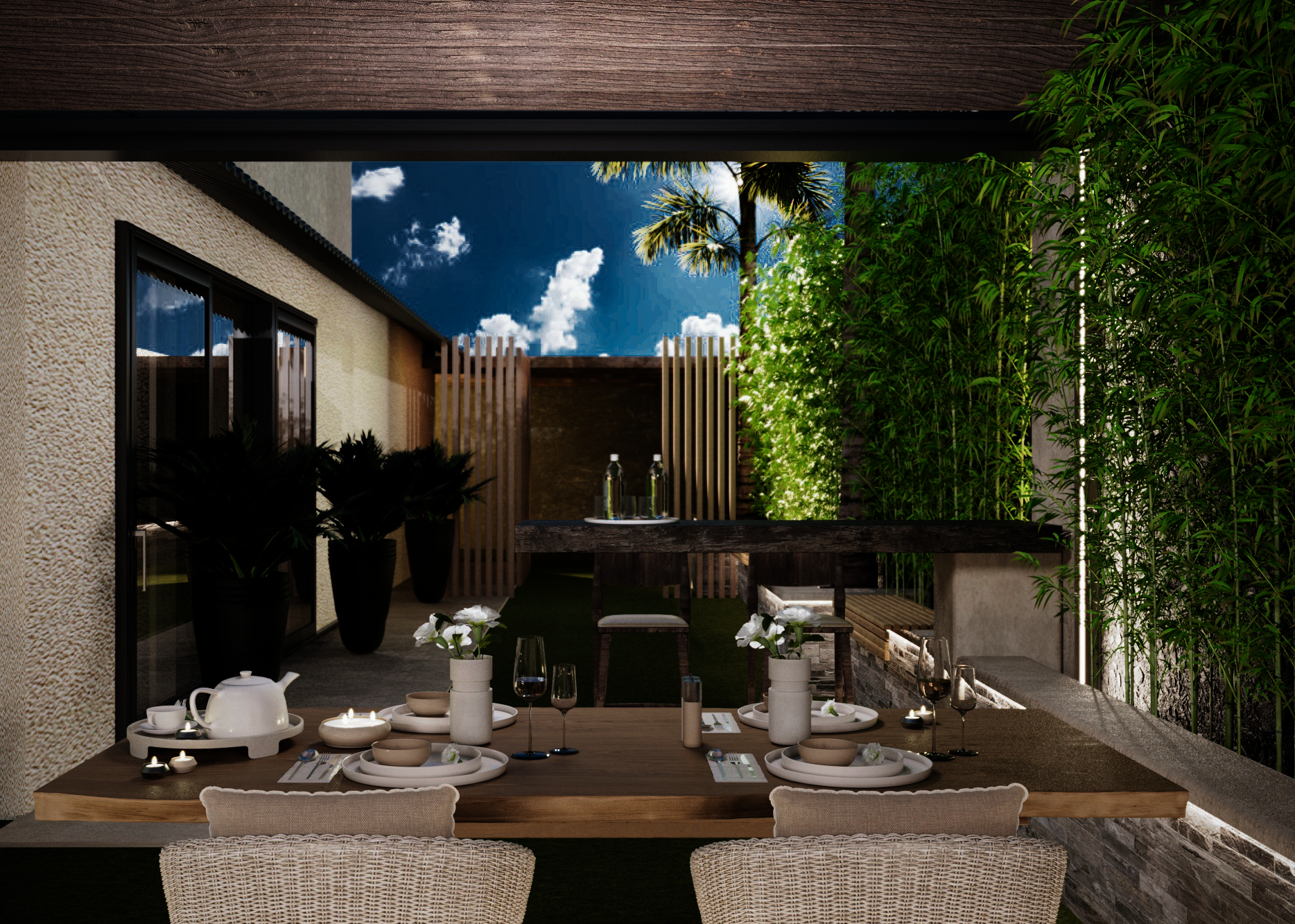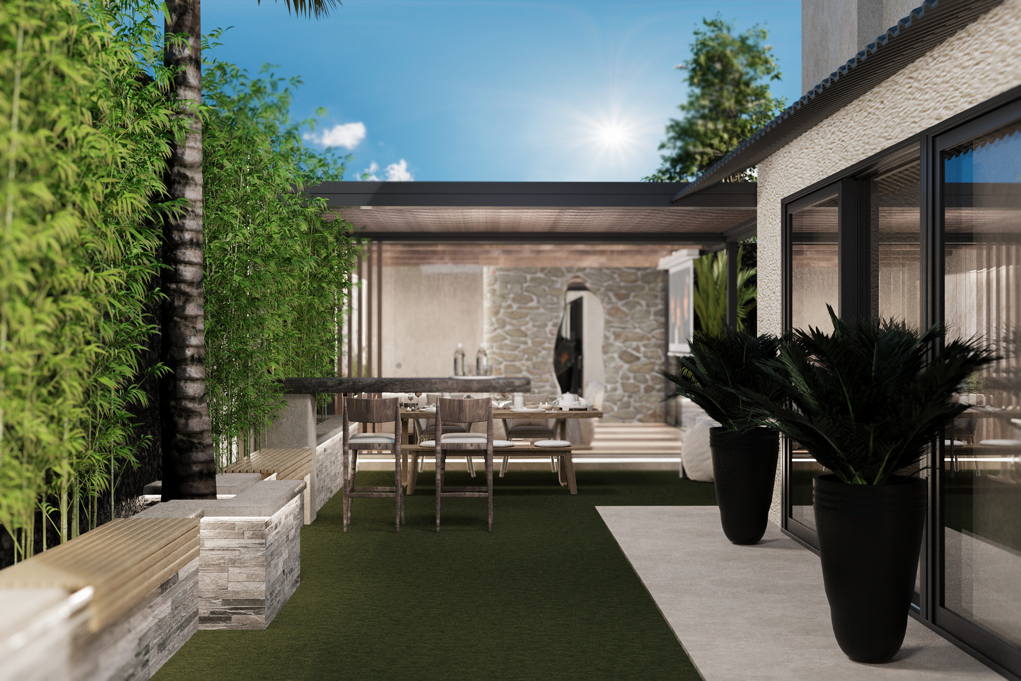 The exterior design of the modern rustic style embodies a harmonious blend of nature and comfort, with natural materials such as wood and stone dominating the architectural details. The serene pool, complemented by a flowing waterfall, adds a sense of tranquility, while being surrounded by an abundance of plants, transforming the space into a vibrant green oasis. Beauty and warmth come together in the enclosed seating area made of natural wood, where comfort seamlessly blends with the charming rural ambiance. Scattered trees and plant-filled pathways complete the overall scene, reflecting a design that unites humanity with nature in a serene and inspiring setting.