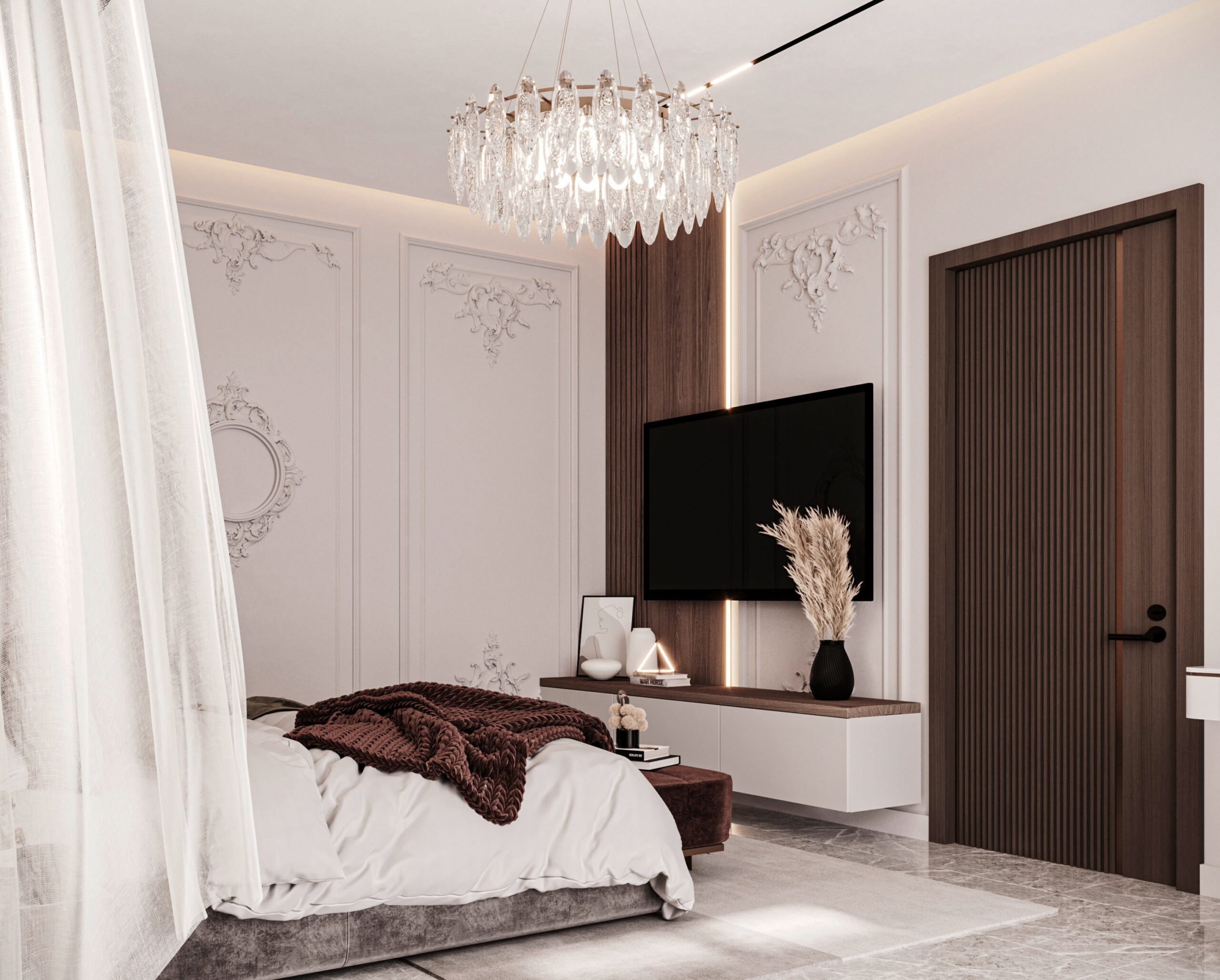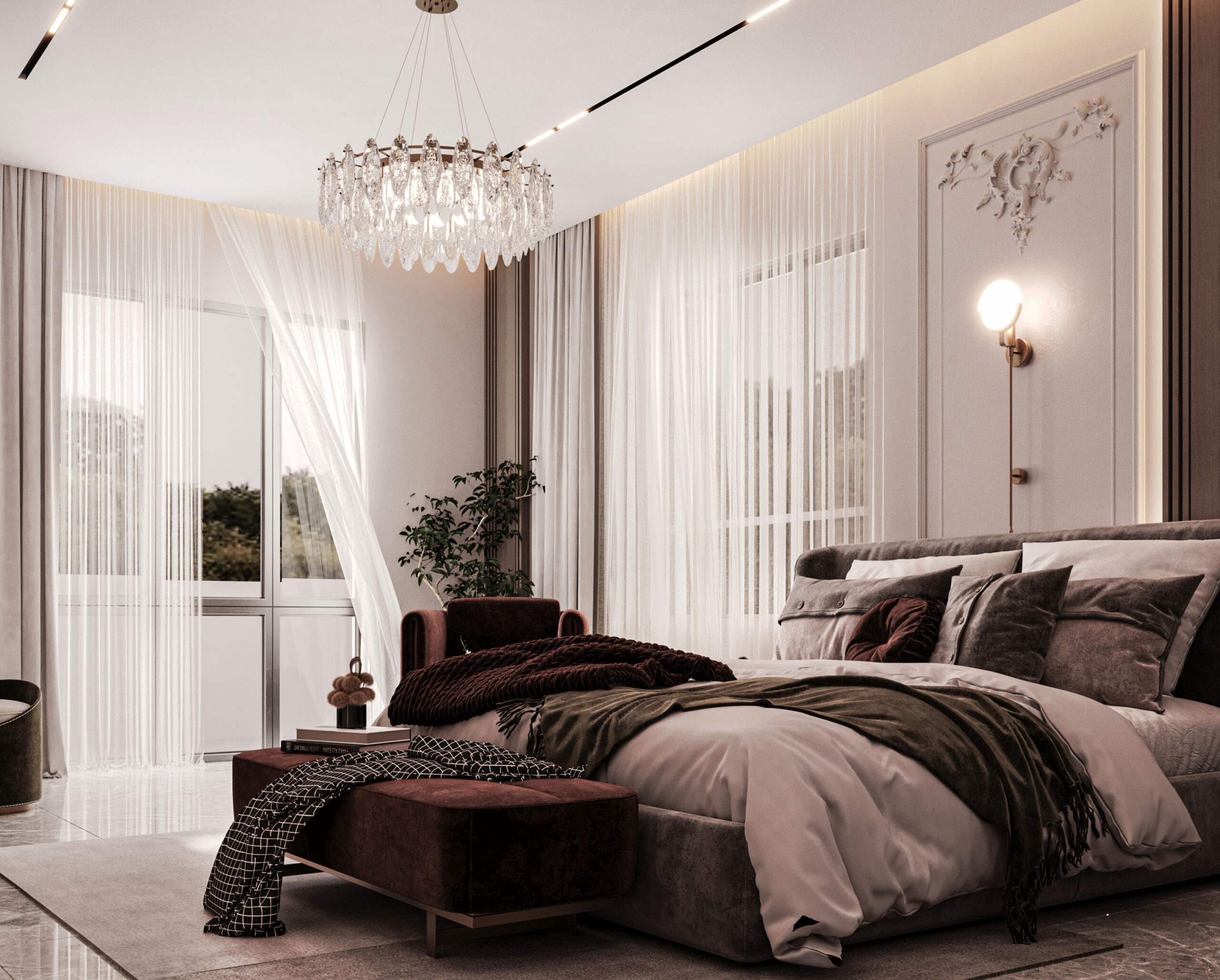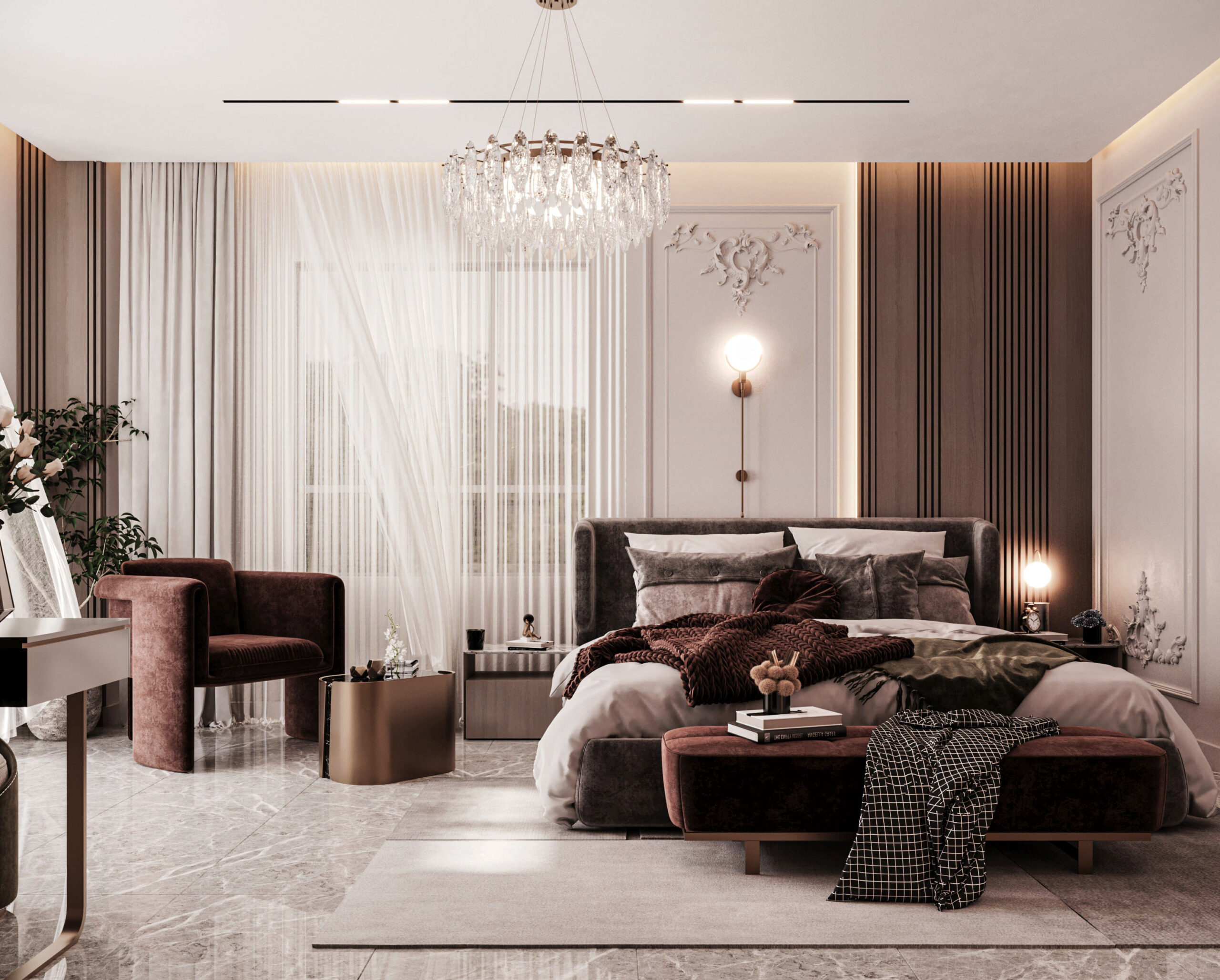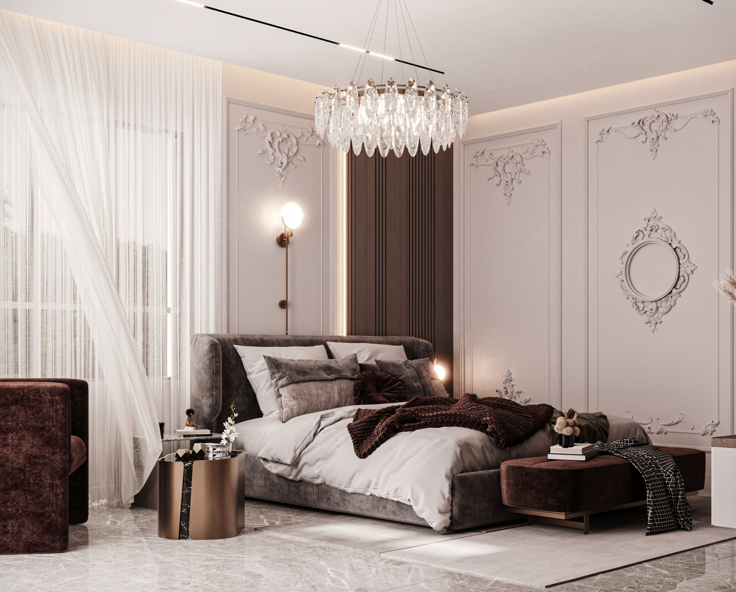 The image features a modern neo-classical bedroom design, where the walls are adorned with classical moldings, and the ceiling remains minimalistic with LED lighting and a luxurious crystal chandelier. The flooring is made of marble, accompanied by a neutral-toned rug. The furnishings include a softly upholstered bed, a burgundy-colored bench and sofa, and a gold-finished side table. The lighting is distributed between a central chandelier and modern wall sconces, while sheer curtains add a touch of softness and elegance. The design strikes a balance between classical sophistication and modern minimalism, accentuated by a serene color palette and subtle luxury.