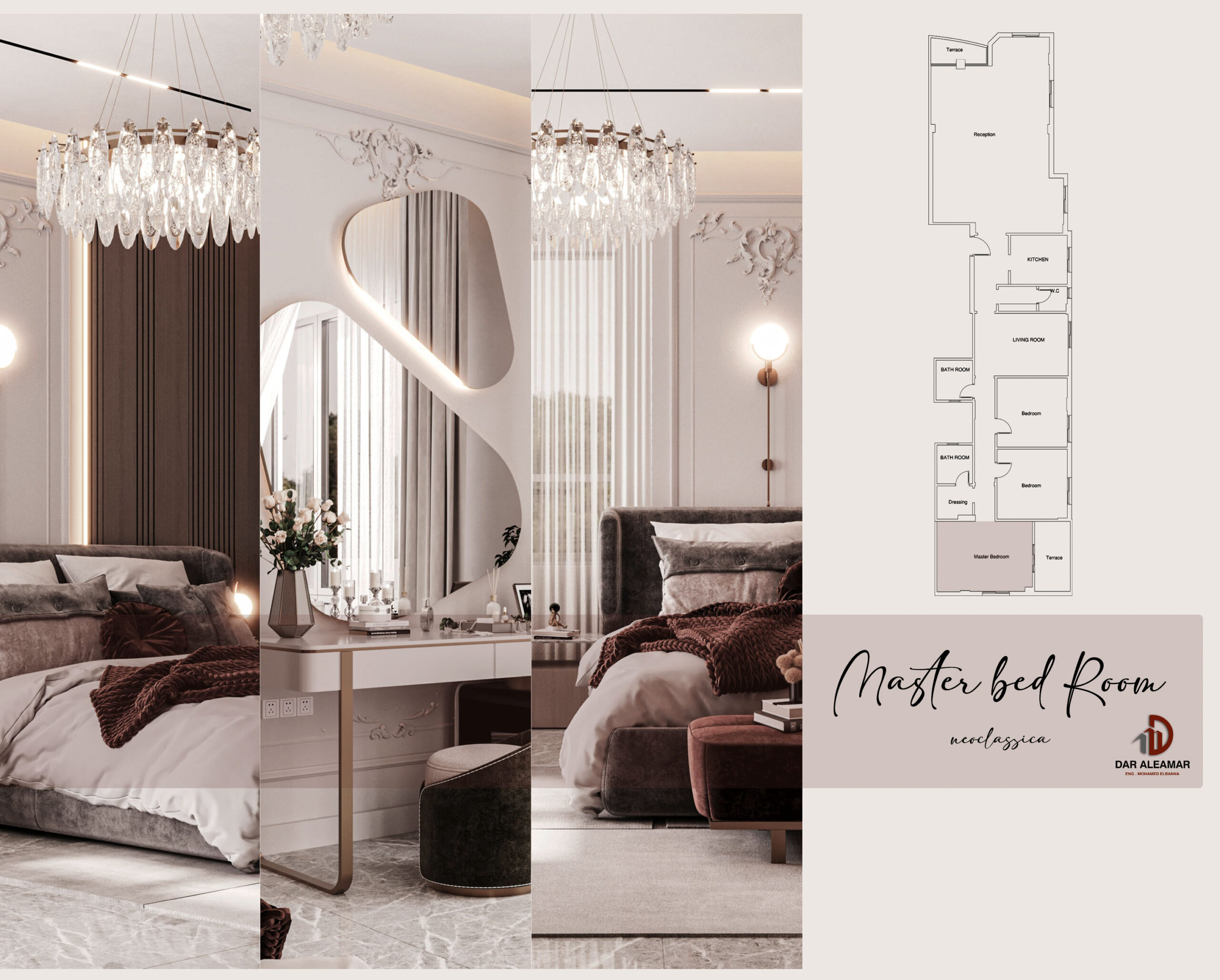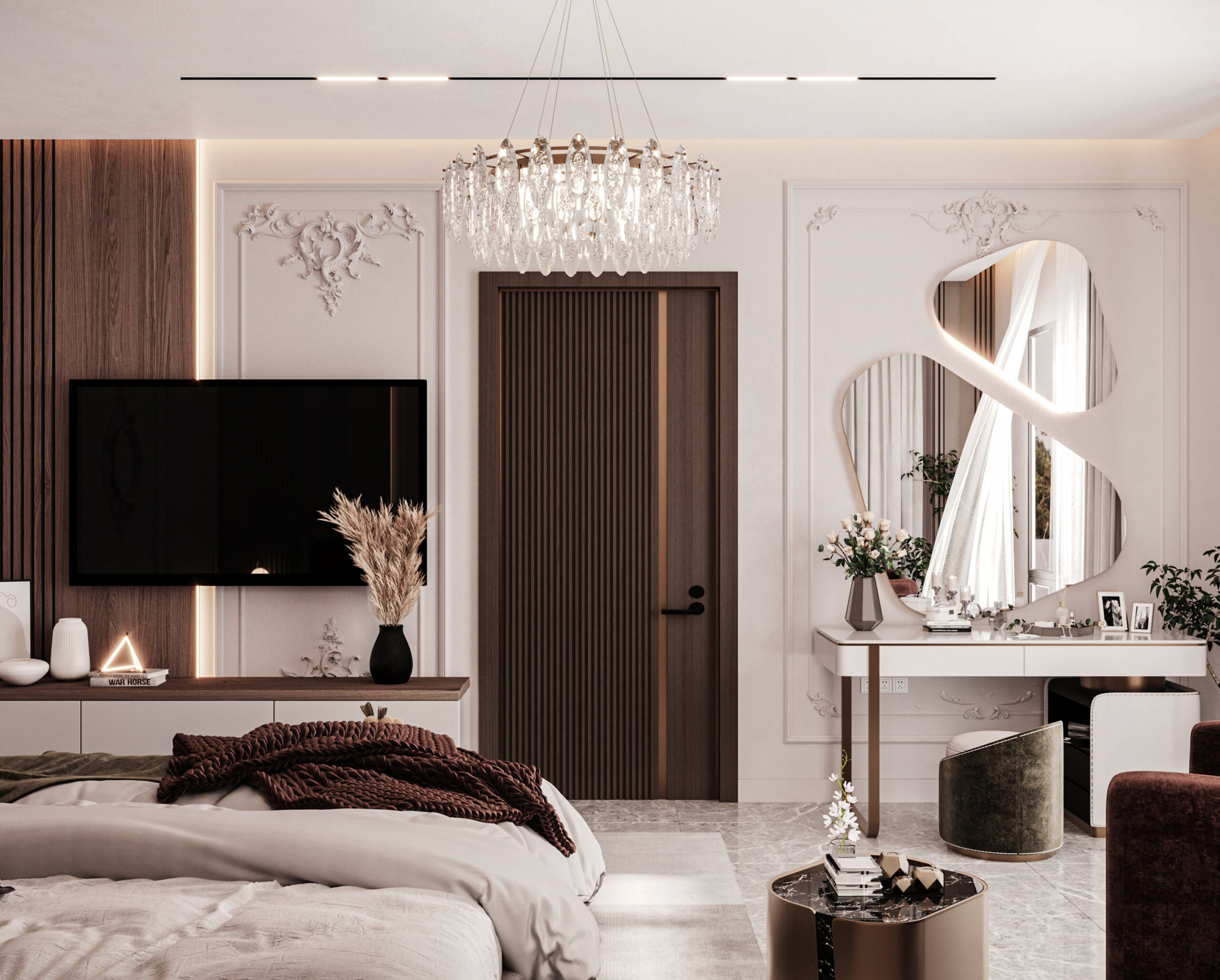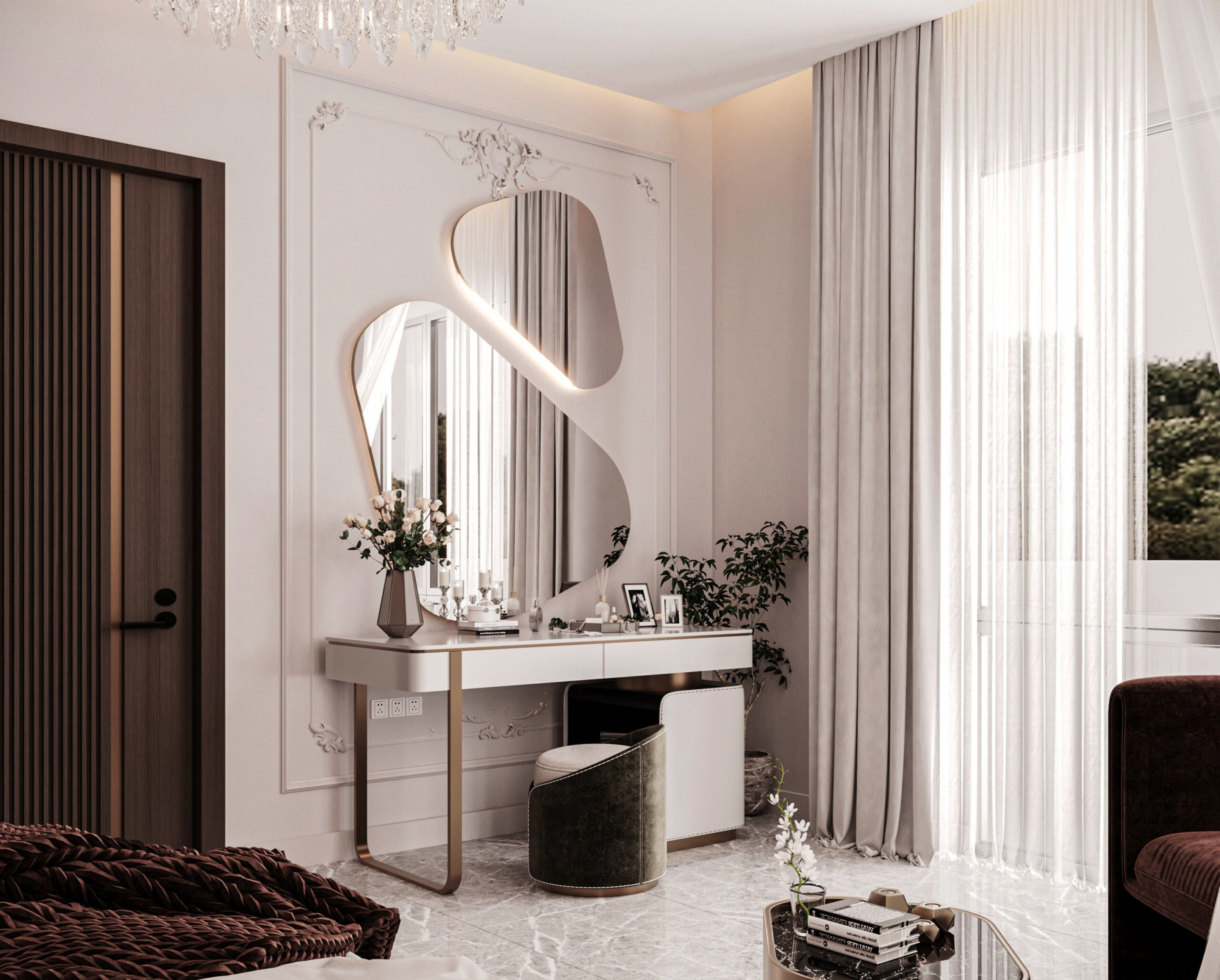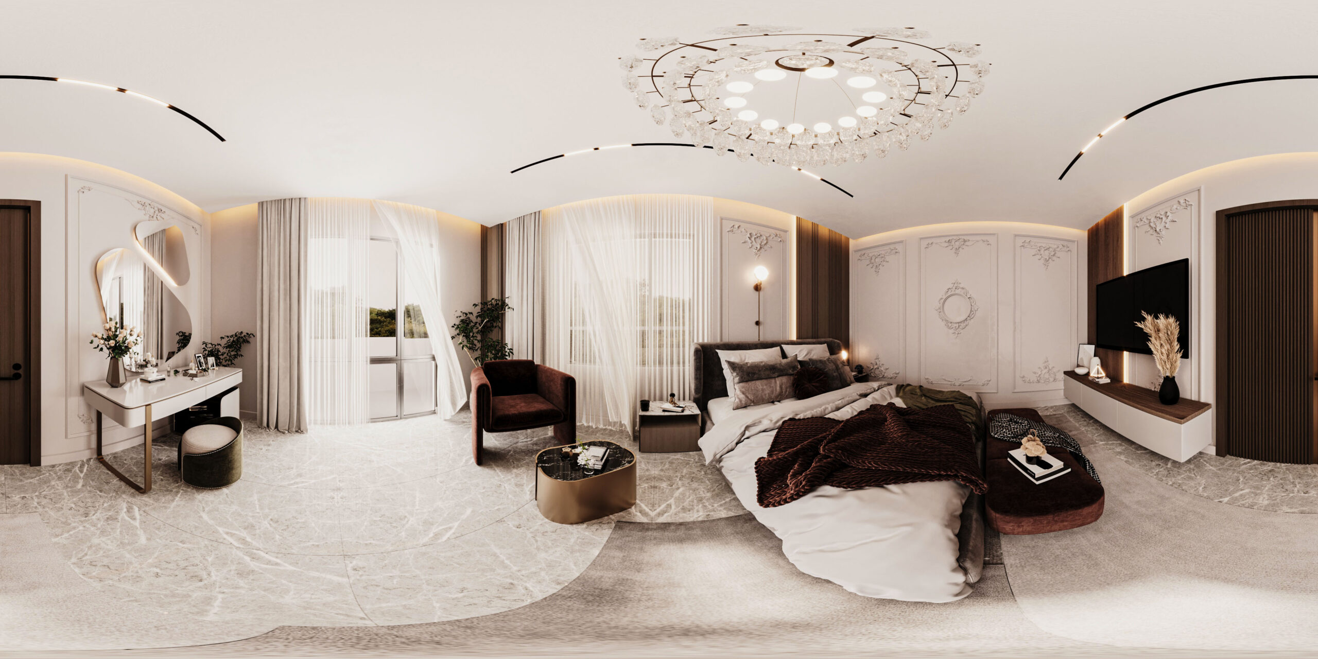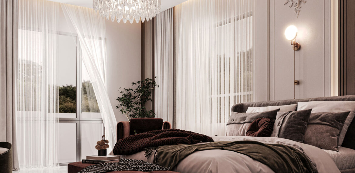 The image features a modern neo-classical bedroom design, where the walls are adorned with classical moldings, and the ceiling remains minimalistic with LED lighting and a luxurious crystal chandelier. The flooring is made of marble, accompanied by a neutral-toned rug. The furnishings include a softly upholstered bed, a burgundy-colored bench and sofa, and a gold-finished side table. The lighting is distributed between a central chandelier and modern wall sconces, while sheer curtains add a touch of softness and elegance. The design strikes a balance between classical sophistication and modern minimalism, accentuated by a serene color palette and subtle luxury.