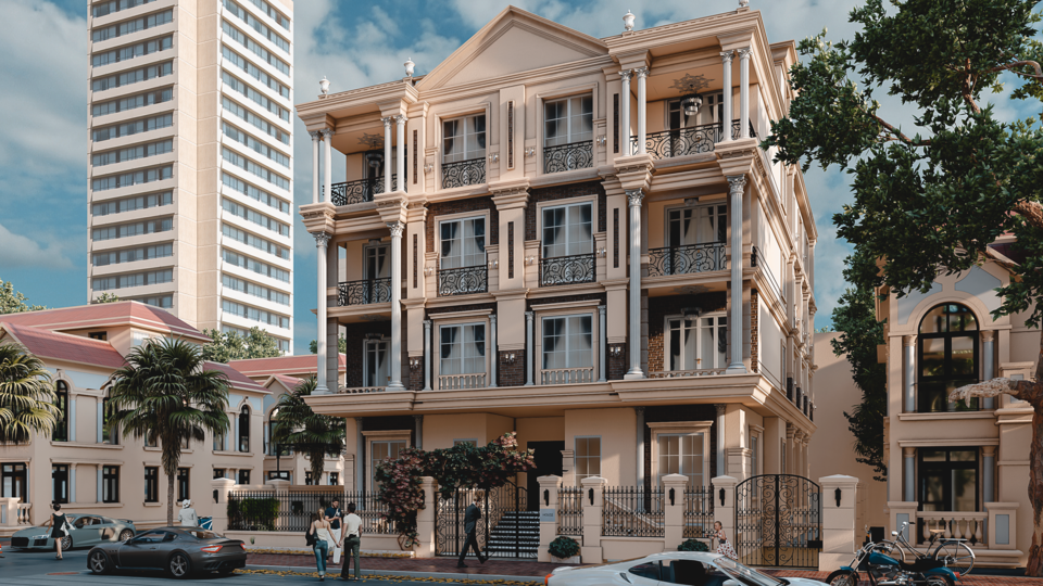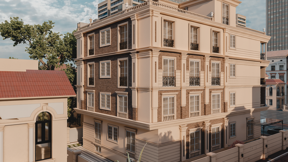 - The façade is adorned with Corinthian columns, extending across two floors, exuding grandeur and timeless sophistication.