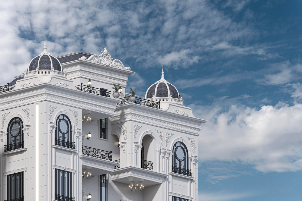 - Elegant Color Palette: The exterior features an ivory-white finish, exuding opulence, complemented by dark accents on the windows and wrought-iron railings for a striking contrast.