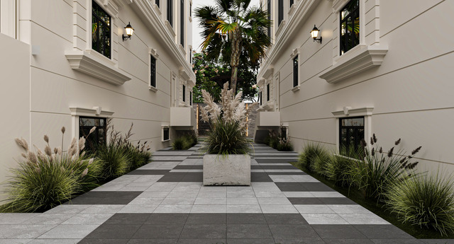 - Graceful Arched Windows & Wrought-Iron Balconies: The tall, arched windows allow for an abundance of natural light, while the intricately designed wrought-iron railings enhance the façade’s visual sophistication.