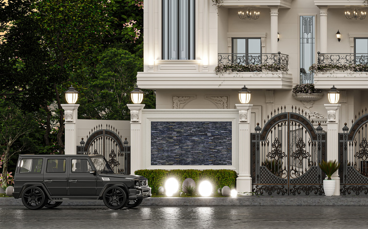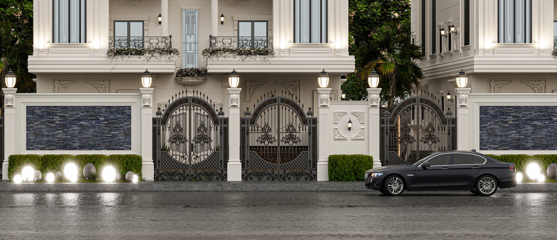 - Grand Entrance & Ornamental Perimeter: The compound is enclosed by a stately fence featuring arched gates with finely crafted ironwork, striking the perfect balance between security and aesthetic allure.